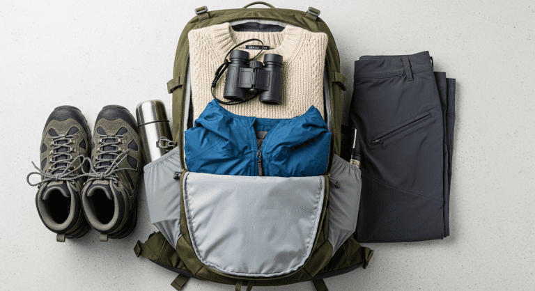• Layered clothing: The weather can shift quickly. Pack a combination of light base layers, warm mid-layers (like fleece), and a waterproof, wind-resistant outer shell.